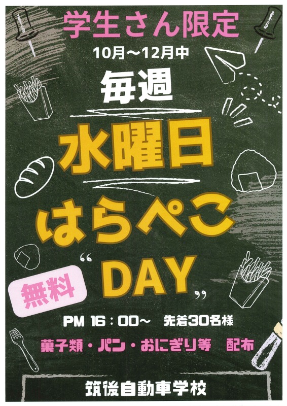 はらぺこDAY🍟 投稿日 2025年10月2日 著者 cds_wrote カテゴリー NEWS 筑後自動車学校では、10月から12月までの毎週水曜日16:00からはらぺこDAYを開催いたします。無料にて菓子類等を提供いたします。(学生さん限定)お腹を空かせてお友達とご一緒にお越しください。