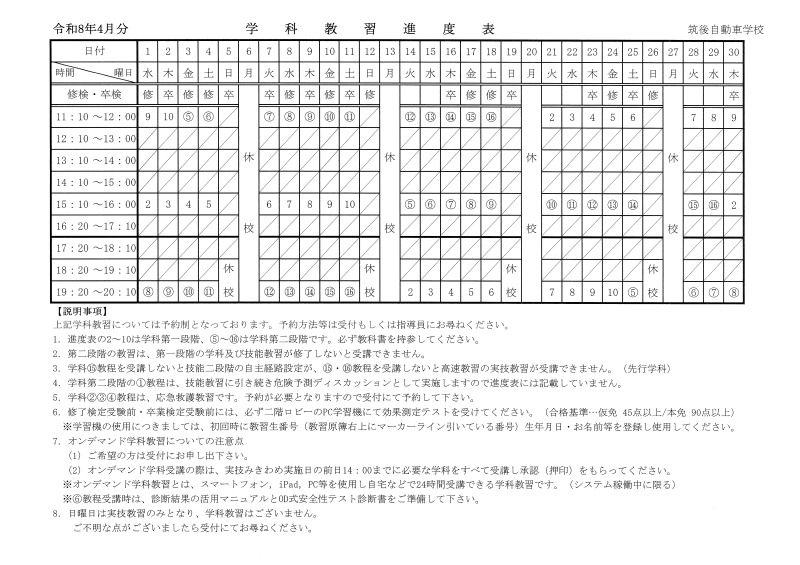修:修了検定(仮免) / 卒:卒業検定